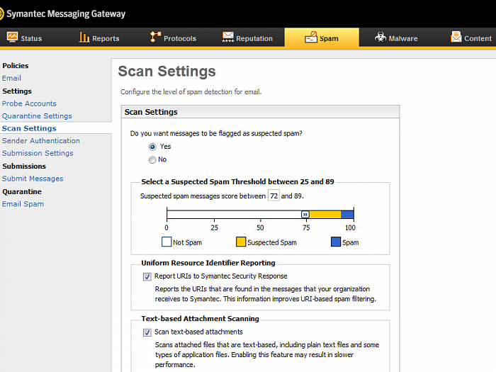 Messaging Gateway использует обновляющиеся в реальном времени компоненты антиспам и антивирусной защиты, получаемые от Глобальной Аналитической Сети Symantec GIN (Global Intelligence Network). Осуществляет фильтрацию трафика по индивидуальным для организации правилам и регулирует пропускную способность на основании репутации IP адреса (по глобальной и самообучающейся базам).