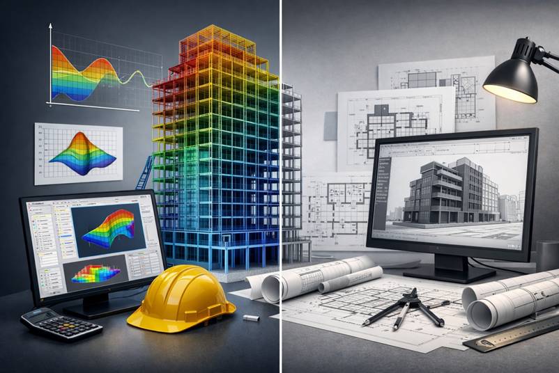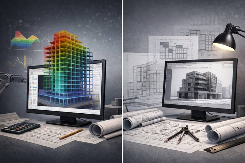 У типовому проєктному процесі CAD-система використовується для створення креслень і підготовки документації. У ній формується геометрія будівлі, деталізуються вузли, оформлюються плани та розрізи. Однак сама по собі CAD-модель не підтверджує, що конструкція витримає навантаження.